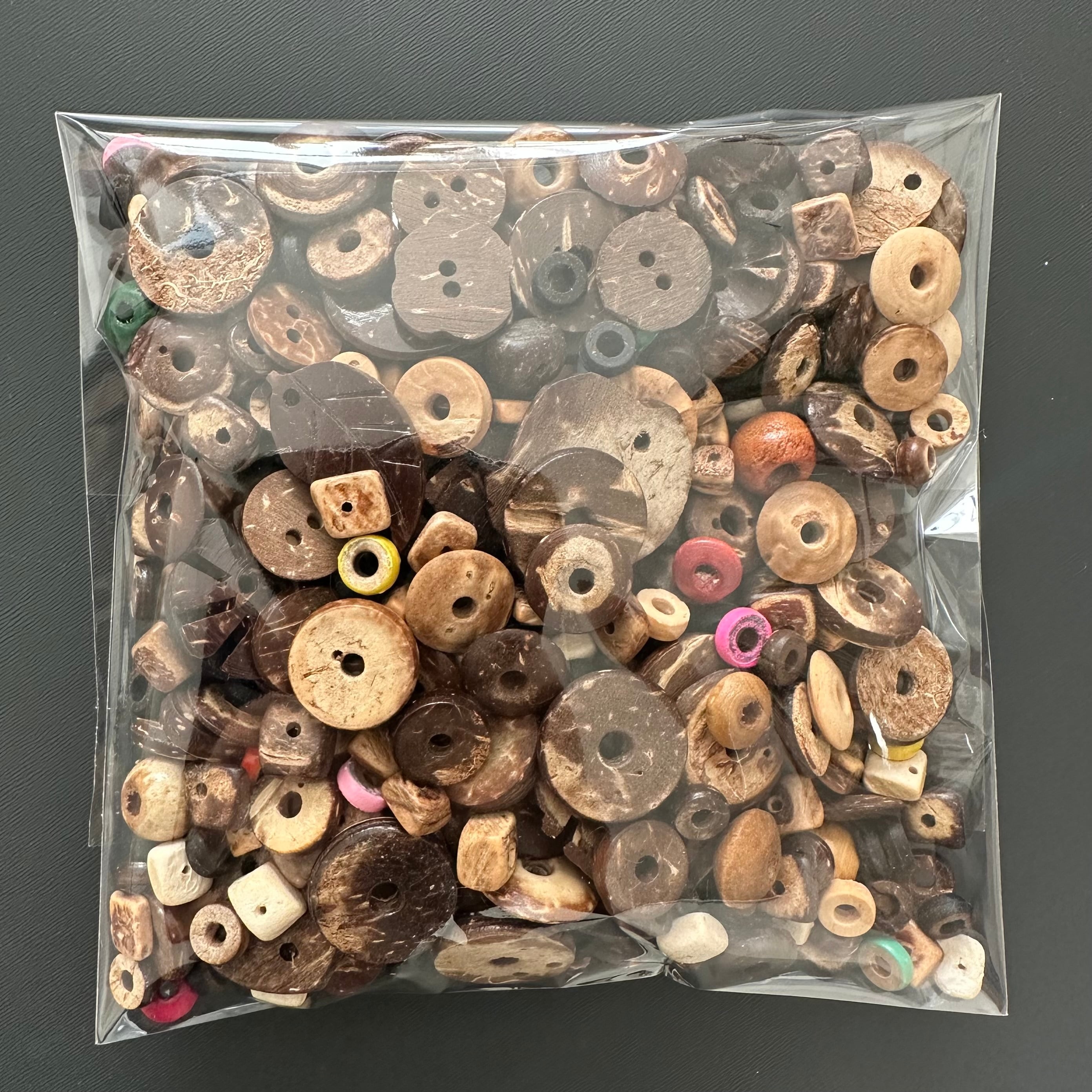 旅先で集めて、大切に保管してきたウッドビーズ、ココナッツビーズパーツの詰め合わせです。